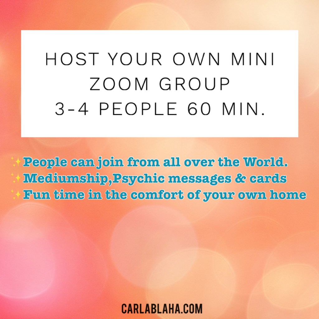 Book Your Own “Mini Zoom Group” Connecting To Loved Ones & Pets. The beauty of a mini group psychic stuff too! 3-4 people group price $350.00